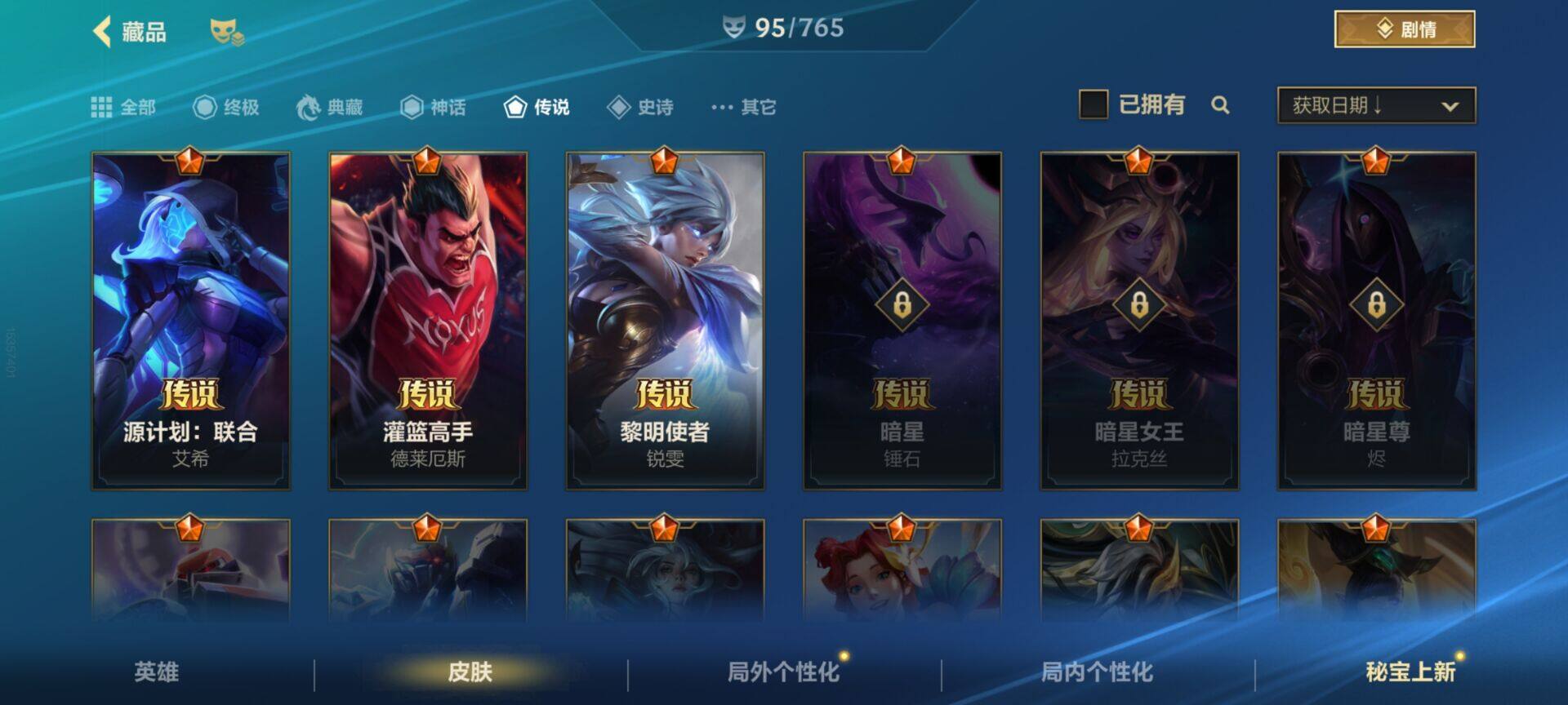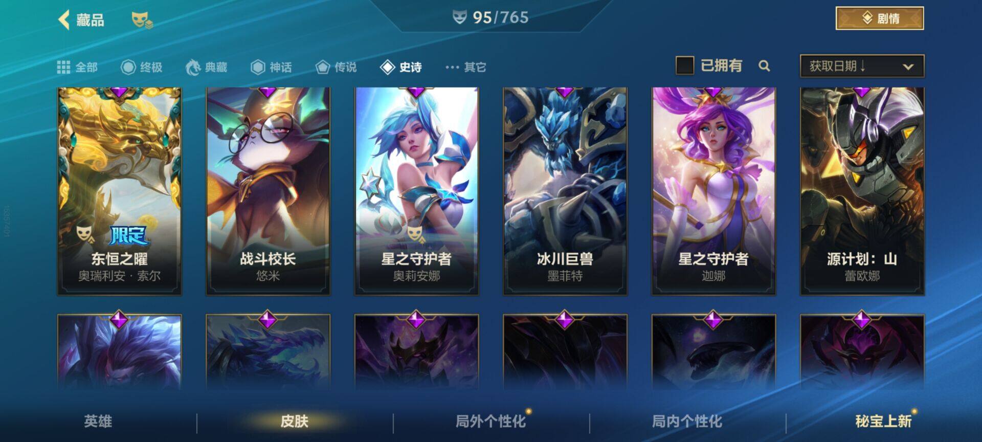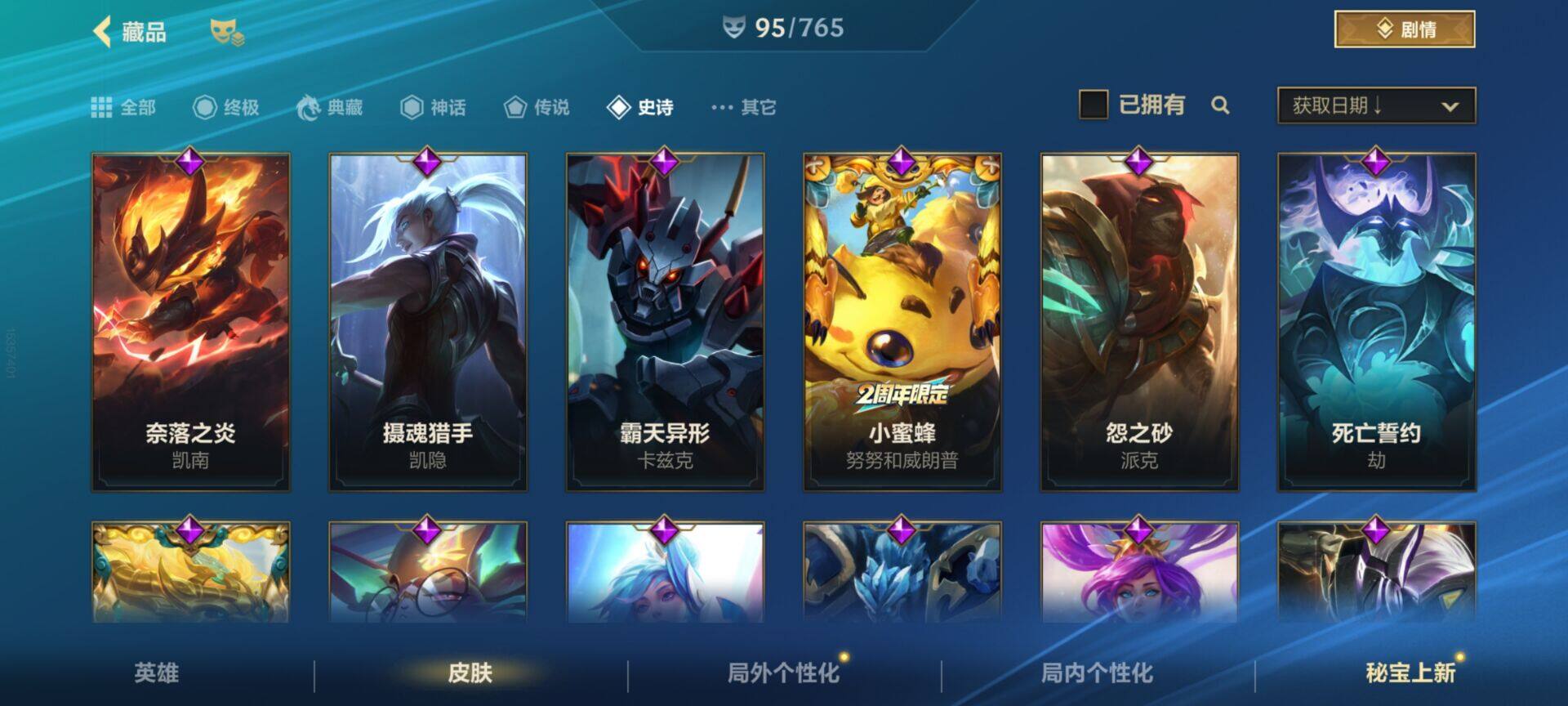 【史诗皮肤】 钢铁军团盖伦 星之守护者拉克丝 恶魔之刃泰达米尔 霸天异形-卡兹克 腥红之月崔斯特 苹果机器人布里茨 死亡誓约劫 源计划山蕾欧娜 星之守护者迦娜 冰川巨兽墨菲特 银河魔装机神菲兹 觅心射手-维鲁斯