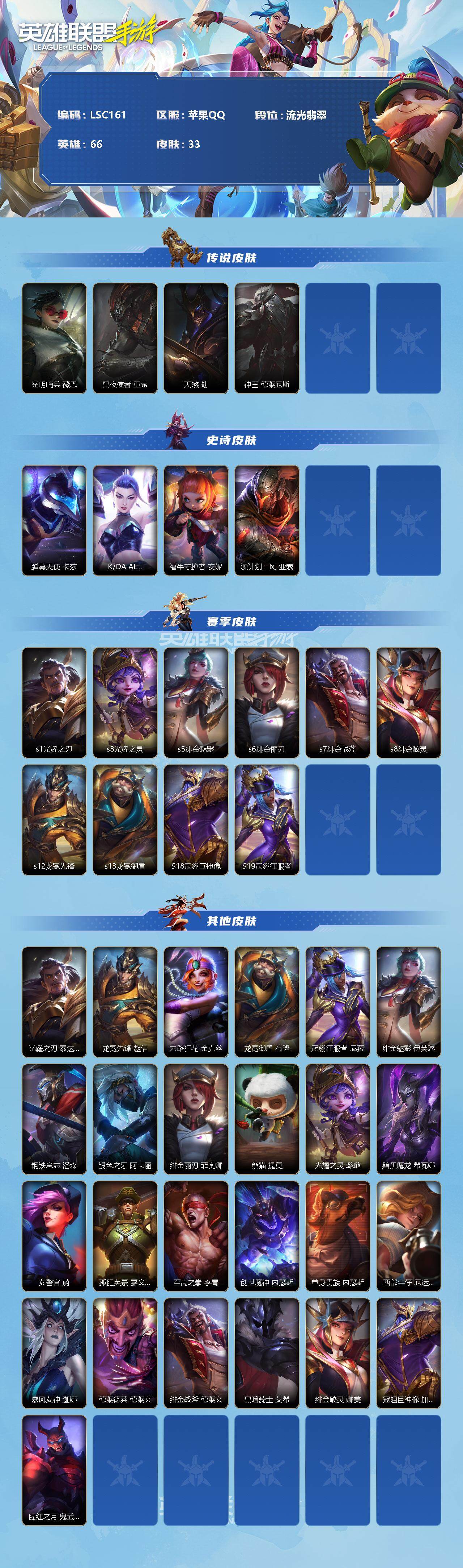【LSC161】66英雄/33皮肤/流光翡翠/光明哨兵薇恩/黑夜使者亚索/天煞劫/神王-德莱厄斯/弹幕天使卡莎/K/DA-卡莎/福牛守护者安妮/源计划风亚索/s1光耀之刃/s3光耀之灵/s5绯金魅影/s6绯金丽刃/s7绯金战斧/s8绯金鮫灵/s12龙冕先锋/s13龙冕御盾/S18冠翎巨神像/S19冠翎征服者/光耀之刃 泰达米尔/龙冕先锋 赵信/末路狂花 金克丝/龙冕御盾 布隆/冠翎征服者 尼菈/绯金魅影 伊芙琳/钢铁意志 潘森/银色之牙 阿卡丽/绯金丽刃 菲奥娜/熊猫 提莫/光耀之灵 璐璐/黯黑魔龙 希瓦娜/女警官 蔚/孤胆英豪 嘉文四世/至高之拳 李青/创世魔神 内瑟斯/单身贵族 内瑟斯/西部牛仔 厄运小姐/暴风女神 迦娜/德莱德莱 德莱文/绯金战斧 德莱文/黑暗骑士 艾希/绯金鲛灵 娜美/冠翎巨神像 加里奥/腥红之月 鬼武者 慎【二次实名: 可二次】