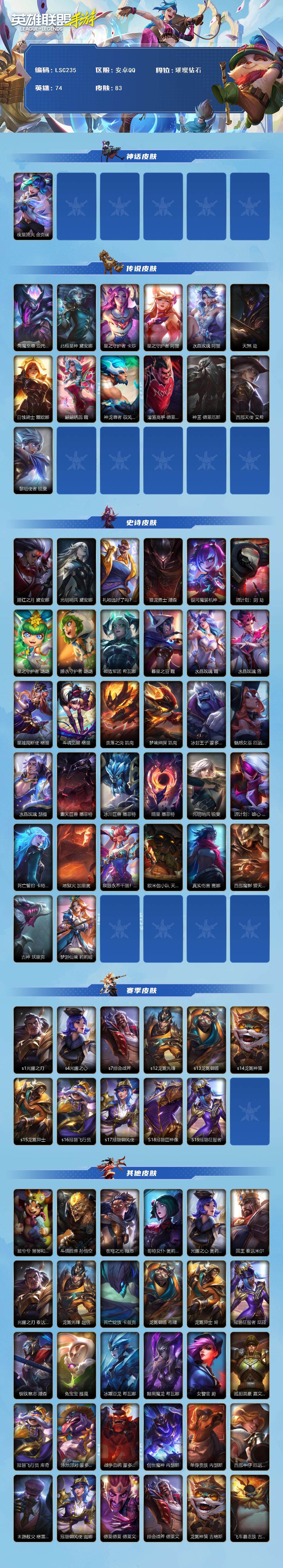 【LSC235】74英雄/83皮肤/1神话/13传说/33史诗/璀璨钻石/夜星流火 金克丝/海魔至尊 亚托克斯/北极星神 黛安娜/星之守护者 卡莎/星之守护者-阿狸/水晶玫瑰 阿狸/天煞劫/日蚀骑士 蕾欧娜/翩翩绣蕊 霞/神龙尊者御风啸龙易/灌篮高手/神王-德莱厄斯/西部天使 艾希/黎明使者瑞文/腥红之月戴安娜/光明哨兵 黛安娜/礼物选好了吗? 布隆/猎龙勇士潘森/银河魔装机神 安妮/源计划阴劫/星之守护者璐璐/睡衣守护者 璐璐/破败军团 希瓦娜/暮星之羽霞/水晶玫瑰 霞/水晶玫瑰 洛/星域裁断使 格温/斗魂觉醒 格温/奈落之炎 凯南/梦境绅探 凯南/冰封王子 蒙多医生/魅惑女巫 厄运小姐/水晶玫瑰 瑟提/霸天巨兽墨菲特/冰川巨兽墨菲特/暗星 墨菲特/光明哨兵 锐雯/源计划-卡特琳娜/死亡誓约卡特琳娜/地狱火 加里奥/泉眼永不干涸! 丽桑卓/欧米伽小队 天雷爆破手 维迦/真实伤害赛娜/西部魔影 猎天使恶魔 泰隆/古神 沃里克/梦游仙境 莉莉娅/s1光耀之刃/s4光耀之心/s7绯金战斧/s12龙冕先锋/s13龙冕御盾/s14龙冕神策/s15龙冕异士/s16冠翎飞行员/s17冠翎御风使/S18冠翎巨神像/S19冠翎征服者/脏兮兮 努努和威朗普/斗战胜佛 孙悟空/苍穹之光 薇恩/哥特女仆 奥莉安娜/光耀之心 奥莉安娜/国王 泰达米尔/光耀之刃 泰达米尔/龙冕先锋 赵信/死亡绽放 卡兹克/龙冕御盾 布隆/龙冕异士 烬/冠翎征服者 尼菈/钢铁意志 潘森/兔宝宝 提莫/冰霜亚龙 希瓦娜/黯黑魔龙 希瓦娜/女警官 蔚/孤胆英豪 嘉文四世/冠翎飞行员 库奇/泳池派对 蒙多医生/战争血统 蒙多医生/创世魔神 内瑟斯/单身贵族 内瑟斯/西部牛仔 厄运小姐/末路教父 格雷福斯/冠翎御风使 迦娜/德莱德莱 德莱文/绯金战斧 德莱文/龙冕神策 吉格斯/飞车暴走族 古拉加斯/碎桶者 古拉加斯/蕉泥座人 索拉卡/冠翎巨神像 加里奥/铁哥们儿 奥拉夫/鳄霸 雷克顿/南瓜头 费德提克【二次实名: 可二次】