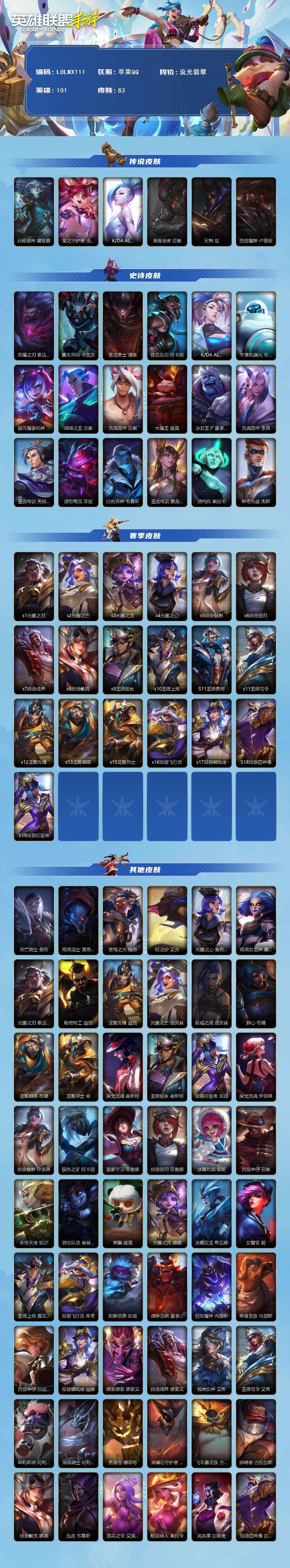 【LOLMX111】101英雄/83皮肤/流光翡翠/北极星神 黛安娜/星之守护者金克丝/K/DA-萨勒芬妮/黑夜使者亚索/天煞劫/西部魔影卢锡安/恶魔之刃泰达米尔/霸天异形-卡兹克/猎龙勇士潘森/铁血女忍阿卡丽/K/DA-阿卡丽/苹果机器人布里茨/银河魔装机神 安妮/战场之王 亚索/灵魂莲华 亚索/大魔王提莫/冰封王子 蒙多医生/灵魂莲华 永恩/玉剑传说无极易/虚空海灵菲兹/白色死神维鲁斯/玉剑传说 舞剑仙 艾瑞莉娅/源代码索拉卡/神奇先驱 杰斯/s1光耀之刃/s2光耀之芒/s3光耀之灵/s4光耀之心/s5绯金魅影/s6绯金丽刃/s7绯金战斧/s8绯金鮫灵/s9王牌舰长/s10王牌上将/S11王牌勇将/s11王牌司令/s12龙冕先锋/s13龙冕御盾/s15龙冕异士/s16冠翎飞行员/s17冠翎御风使/S18冠翎巨神像/S19冠翎征服者/死亡骑士 盖伦/暗黑武士 雷恩加尔/苍穹之光 薇恩/时之砂 艾克/光耀之心 奥莉安娜/暗黑女武神 黛安娜/光耀之刃 泰达米尔/秘密特工 赵信/龙冕先锋 赵信/光耀之芒 金克丝/双城之战 金克丝/狮心 布隆/龙冕御盾 布隆/龙冕异士 烬/探戈灵魂 崔斯特/王牌舰长 崔斯特/冠翎征服者 尼菈/探戈灵魂 伊芙琳/绯金魅影 伊芙琳/银色之牙 阿卡丽/皇家守卫 菲奥娜/绯金丽刃 菲奥娜/冰霜烈焰 安妮/西部牛仔 亚索/末世天使 凯尔/游击队员 崔丝塔娜/熊猫 提莫/光耀之灵 璐璐/冰霜亚龙 希瓦娜/女警官 蔚/王牌上将 嘉文四世/冠翎飞行员 库奇/刺客信条 凯南/战争血统 蒙多医生/创世魔神 内瑟斯/单身贵族 内瑟斯/西部牛仔 厄运小姐/冠翎御风使 迦娜/德莱德莱 德莱文/绯金战斧 德莱文/极地女神 艾希/王牌司令 艾希/哞利斯塔 阿利斯塔/黑暗骑士 阿利斯塔/无畏号 墨菲特/黑曜石守护者 墨菲特/飞车暴走族 古拉加斯/碎桶者 古拉加斯/绯金鲛灵 娜美/迅箭 韦鲁斯/莲花之令 艾瑞莉娅/蕉泥座人 索拉卡/风执事 加里奥/冠翎巨神像 加里奥/光明之锤 杰斯/王牌勇将 奥拉夫/铁血狙击手 凯特琳/鳄霸 雷克顿【二次实名: 可二次】