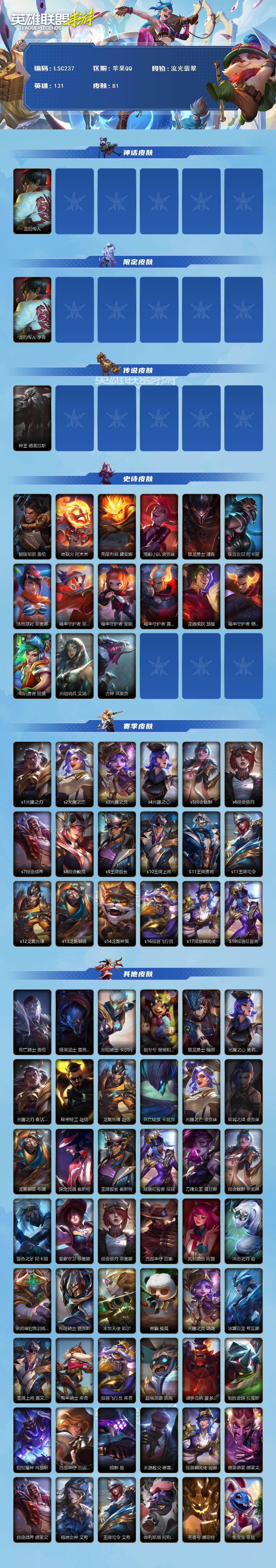 【LSC237】131英雄/81皮肤/1神话/1传说/15史诗/流光翡翠/龙的传人 李青/神王-德莱厄斯/钢铁军团盖伦/地狱火阿木木/无限烈焰戴安娜/清剿小队 金克丝/猎龙勇士潘森/铁血女忍阿卡丽/泳池派对菲奥娜/福牛守护者菲奥娜/福牛守护者安妮/福牛守护者嘉文四世/龙腾虎跃 瑟提/福牛守护者德莱厄斯/电玩勇者瑞文/光明哨兵 艾瑞莉娅/古神 沃里克/s1光耀之刃/s2光耀之芒/s3光耀之灵/s4光耀之心/s5绯金魅影/s6绯金丽刃/s7绯金战斧/s8绯金鮫灵/s9王牌舰长/s10王牌上将/S11王牌勇将/s11王牌司令/s12龙冕先锋/s13龙冕御盾/s14龙冕神策/s16冠翎飞行员/s17冠翎御风使/S19冠翎征服者/死亡骑士 盖伦/暗黑武士 雷恩加尔/光明骑士 卡尔玛/脏兮兮 努努和威朗普/猎龙勇士 薇恩/光耀之心 奥莉安娜/光耀之刃 泰达米尔/秘密特工 赵信/龙冕先锋 赵信/死亡绽放 卡兹克/光耀之芒 金克丝/双城之战 金克丝/龙冕御盾 布隆/探戈灵魂 崔斯特/王牌舰长 崔斯特/冠翎征服者 尼菈/刀锋女王 莫甘娜/绯金魅影 伊芙琳/银色之牙 阿卡丽/皇家守卫 菲奥娜/绯金丽刃 菲奥娜/西部牛仔 亚索/风纪委员 阿狸/冲击之刃 劫/宗师级钓鱼训练师 贾克斯/光明骑士 贾克斯/末世天使 凯尔/熊猫 提莫/光耀之灵 璐璐/冰霜亚龙 希瓦娜/王牌上将 嘉文四世/海牛骑手 库奇/冠翎飞行员 库奇/超级英雄 凯南/战争血统 蒙多医生/制胜金球 拉莫斯/创世魔神 内瑟斯/西部牛仔 厄运小姐/暗影 易/末路教父 格雷福斯/冠翎御风使 迦娜/德莱德莱 德莱文/绯金战斧 德莱文/极地女神 艾希/王牌司令 艾希/哞利斯塔 阿利斯塔/无畏号 墨菲特/兔宝宝 菲兹/科学狂人 吉格斯/龙冕神策 吉格斯/鲛妮座人 娜美/绯金鲛灵 娜美/海贼魅影 卡特琳娜/炼金狂士 辛吉德/光执事 伊泽瑞尔/冰川勇者 伊泽瑞尔/风执事 加里奥/光明之锤 杰斯/王牌勇将 奥拉夫/铁血狙击手 凯特琳/腥红之月 鬼武者 慎/黑暗骑士 布兰德/鳄霸 雷克顿/腥红之月 锤石【二次实名: 可二次】