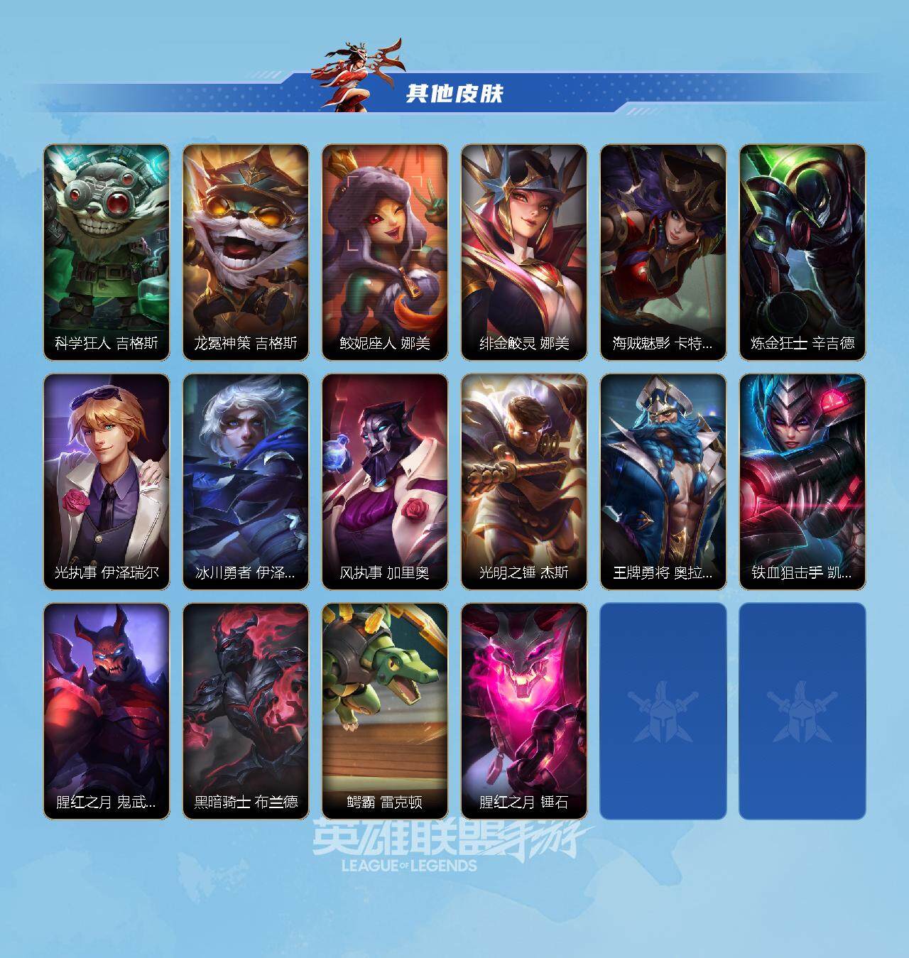 【史诗皮肤】 钢铁军团盖伦 地狱火阿木木 无限烈焰戴安娜 猎龙勇士潘森 铁血女忍阿卡丽 泳池派对菲奥娜 福牛守护者菲奥娜 福牛守护者安妮 福牛守护者嘉文四世 福牛守护者德莱厄斯 电玩勇者瑞文
