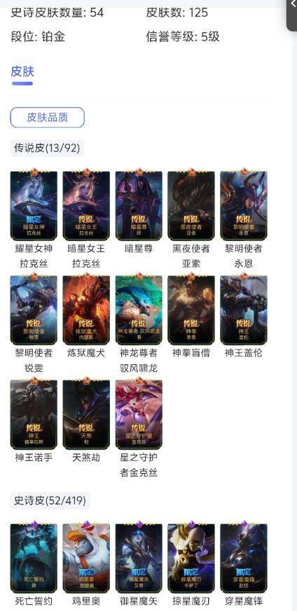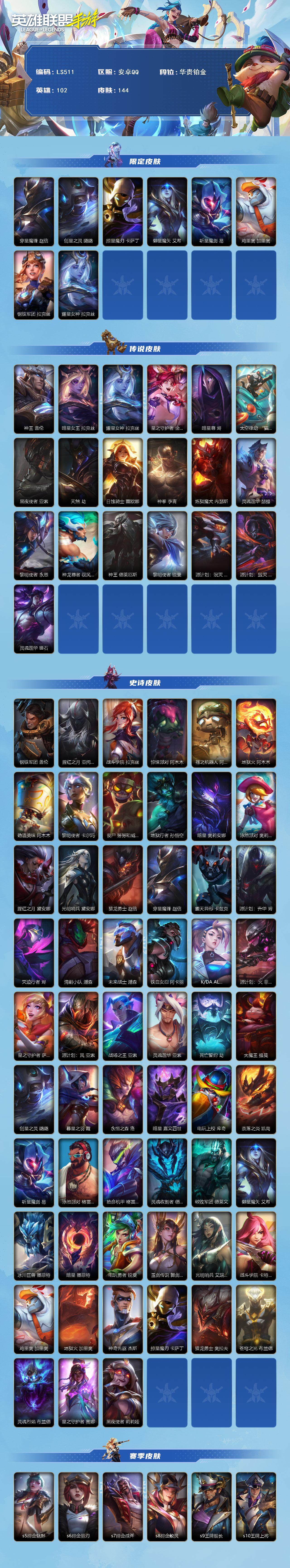 【LS511】102英雄/144皮肤/华贵铂金/穿星魔锋 赵信/创星之灵 璐璐/掠星魔刃 卡萨丁/御星魔矢 艾希/斩星魔剑 易/鸡里奥 加里奥/钢铁军团 拉克丝/耀星女神 拉克丝/神王盖伦/暗星女王拉克丝/耀星女神克拉丝/星之守护者金克丝/暗星尊 烬/太空律动 “猫猫”布里和里茨 布里茨/黑夜使者亚索/天煞劫/日蚀骑士 蕾欧娜/神拳-李青/炼狱魔犬/灵魂莲华 瑟提/黎明使者 永恩/神龙尊者御风啸龙易/神王-德莱厄斯/黎明使者瑞文/源计划:泯灭 雷克顿/源计划:毁灭 派克/灵魂莲华锤石/钢铁军团盖伦/腥红之月 亚托克斯/战斗学院拉克丝/惊悚派对 阿木木/殇之机器人阿木木/地狱火阿木木/劲道美味 阿木木/黎明使者 卡尔玛/丧尸努努和威朗普/地狱行者 孙悟空/暗星奥莉安娜/泳池派对奥利安娜/腥红之月戴安娜/光明哨兵 黛安娜/猎龙勇士赵信/穿星魔锋/霸天异形-卡兹克/源计划-烬/灭迹行者 烬/清剿小队 潘森/未来战士 潘森/铁血女忍阿卡丽/K/DA-阿卡丽/源计划-菲奥娜/星之守护者-萨勒芬妮/源计划风亚索/战场之王 亚索/灵魂莲华 亚索/死亡誓约劫/大魔王提莫/创星之灵/暮星之羽霞/永恒之森 洛/暗星嘉文四世/电玩上校 库奇/奈落之炎 凯南/斩星魔剑/泳池派对 格雷福斯/绝命机甲 格雷福斯/灵魂收割者德莱文/破败军团 德莱文/冰川巨兽墨菲特/暗星 墨菲特/电玩勇者瑞文/玉剑传说 舞剑仙 艾瑞莉娅/光明哨兵 艾瑞莉娅/战斗学院卡特琳娜/地狱火 加里奥/神奇先驱 杰斯/猎龙勇士 奥拉夫/苍穹之光布兰德/灵魂烈焰布兰德/星之守护者-赛娜/黑夜使者 莉莉娅/s5绯金魅影/s6绯金丽刃/s7绯金战斧/s8绯金鮫灵/s9王牌舰长/s10王牌上将/S11王牌勇将/s11王牌司令/s12龙冕先锋/s13龙冕御盾/s14龙冕神策/s15龙冕异士/s16冠翎飞行员/s17冠翎御风使/死亡骑士 盖伦/海上霸主 盖伦/小小骑士 阿木木/三昧真火 孙悟空/猎龙勇士 薇恩/时之砂 艾克/国王 泰达米尔/秘密特工 赵信/龙冕先锋 赵信/死亡绽放 卡兹克/狮心 布隆/龙冕御盾 布隆/龙冕异士 烬/王牌舰长 崔斯特/刀锋女王 莫甘娜/绯金魅影 伊芙琳/钢铁意志 潘森/银色之牙 阿卡丽/皇家守卫 菲奥娜/绯金丽刃 菲奥娜/擂台皇帝 布里茨/冰霜烈焰 安妮/小红帽 安妮/西部牛仔 亚索/腥红之月 亚索/冲击之刃 劫/宗师级钓鱼训练师 贾克斯/末世天使 凯尔/绝命枪手 卢锡安/熊猫 提莫/冰霜亚龙 希瓦娜/王牌上将 嘉文四世/至高之拳 李青/冠翎飞行员 库奇/超级英雄 凯南/战争血统 蒙多医生/熔火之心 拉莫斯/创世魔神 内瑟斯/单身贵族 内瑟斯/西部牛仔 厄运小姐/末路教父 格雷福斯/冠翎御风使 迦娜/绯金战斧 德莱文/极地女神 艾希/女皇 艾希/王牌司令 艾希/腥红之月 基兰/哞利斯塔 阿利斯塔/黑暗骑士 阿利斯塔/无畏号 墨菲特/龙冕神策 吉格斯/碎桶者 古拉加斯/鲛妮座人 娜美/绯金鲛灵 娜美/冰霜之刃 艾瑞莉娅/海贼魅影 卡特琳娜/冲浪高手 辛吉德/炼金狂士 辛吉德/蔷薇绅士 杰斯/光明之锤 杰斯/王牌勇将 奥拉夫/铁血狙击手 凯特琳/腥红之月 鬼武者 慎/枯萎之壤 雷克顿/鳄霸 雷克顿/穿着正装的恶魔 维迦【二次实名: 可二次】