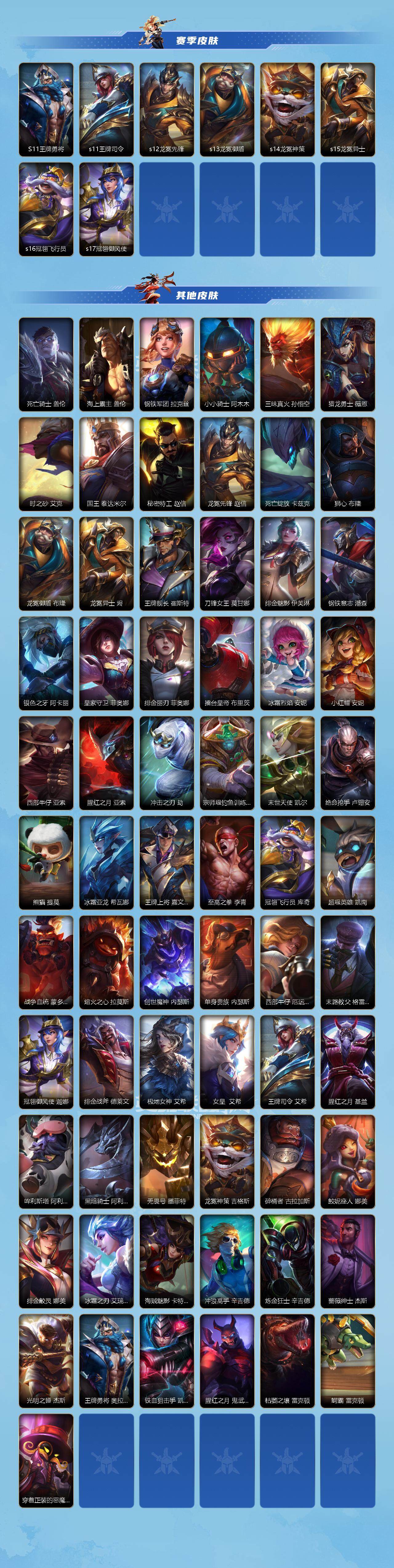 【传说皮肤】 神王盖伦 暗星女王拉克丝 耀星女神克拉丝 星之守护者金克丝 黑夜使者亚索 天煞劫 神拳-李青 炼狱魔犬 神龙尊者御风啸龙易 神王德莱厄斯 黎明使者锐雯 灵魂莲华锤石 源计划-烬 K/DA-阿卡丽 源计划-菲奥娜 星之守护者-萨勒芬妮 星之守护者-赛娜