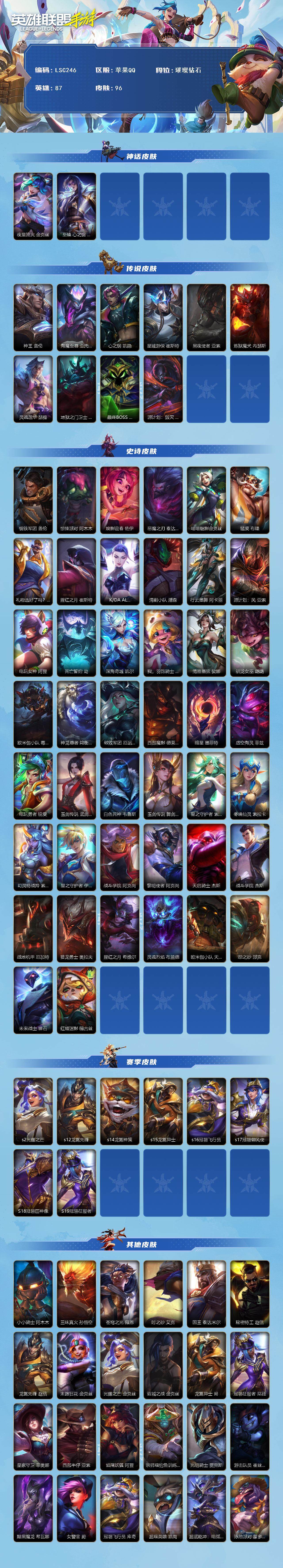 【LSC246】87英雄/96皮肤/3神话/10传说/45史诗/璀璨钻石/夜星流火 金克丝/至臻 心之钢 永恩/神王盖伦/海魔至尊 亚托克斯/心之钢 凯隐/星域游侠崔斯特/黑夜使者亚索/炼狱魔犬/灵魂莲华 瑟提/地狱之门卫士/最终BOSS维迦/源计划:毁灭 派克/钢铁军团盖伦/惊悚派对 阿木木/焕影迎春 佐伊/恶魔之刃泰达米尔/喵喵魅影金克丝/猛虎 布隆/礼物选好了吗? 布隆/腥红之月崔斯特/K/DA-卡莎/清剿小队 潘森/行云墨舞 阿卡丽/源计划风亚索/电玩女神 阿狸/死亡誓约劫/深海奇域 凯尔/我,羽饰骑士 崔丝塔娜/清雅墨弦 娑娜/驯龙女巫 璐璐/欧米伽小队 毒针狙击手 图奇/神龙尊者 均衡之龙 沃利贝尔/破败军团 厄运小姐/西部魔影 德莱厄斯/暗星 墨菲特/虚空海灵菲兹/电玩勇者瑞文/玉剑传说 武剑仙 锐雯/白色死神维鲁斯/玉剑传说 舞剑仙 艾瑞莉娅/星之守护者 索拉卡/冬境仙灵 索拉卡/幻灵特战羚 索拉卡/星之守护者伊泽瑞尔/战斗学院 阿克尚/黎明使者 阿克尚/天启骑士 杰斯/战斗学院 杰斯/战地机甲 厄加特/猎龙勇士 奥拉夫/腥红之月 希维尔/灵魂烈焰布兰德/欧米伽小队 天雷爆破手 维迦/怨之砂 派克/未来战士锤石/红帽迷影 薇古丝/s2光耀之芒/s12龙冕先锋/s14龙冕神策/s15龙冕异士/s16冠翎飞行员/s17冠翎御风使/S18冠翎巨神像/S19冠翎征服者/小小骑士 阿木木/三昧真火 孙悟空/苍穹之光 薇恩/时之砂 艾克/国王 泰达米尔/秘密特工 赵信/龙冕先锋 赵信/末路狂花 金克丝/光耀之芒 金克丝/双城之战 金克丝/龙冕异士 烬/冠翎征服者 尼菈/皇家守卫 菲奥娜/西部牛仔 亚索/焰尾妖狐 阿狸/宗师级钓鱼训练师 贾克斯/光明骑士 贾克斯/游击队员 崔丝塔娜/黯黑魔龙 希瓦娜/女警官 蔚/冠翎飞行员 库奇/超级英雄 凯南/超武乾坤:电弧 凯南/泳池派对 蒙多医生/创世魔神 内瑟斯/热血班长 德莱厄斯/末路教父 格雷福斯/冠翎御风使 迦娜/德莱德莱 德莱文/哞利斯塔 阿利斯塔/黑曜石守护者 墨菲特/龙冕神策 吉格斯/莲花之令 艾瑞莉娅/抵抗军玫瑰 卡特琳娜/冠翎巨神像 加里奥/黑暗骑士 奥拉夫/铁血狙击手 凯特琳/鳄霸 雷克顿【二次实名: 不可二次】