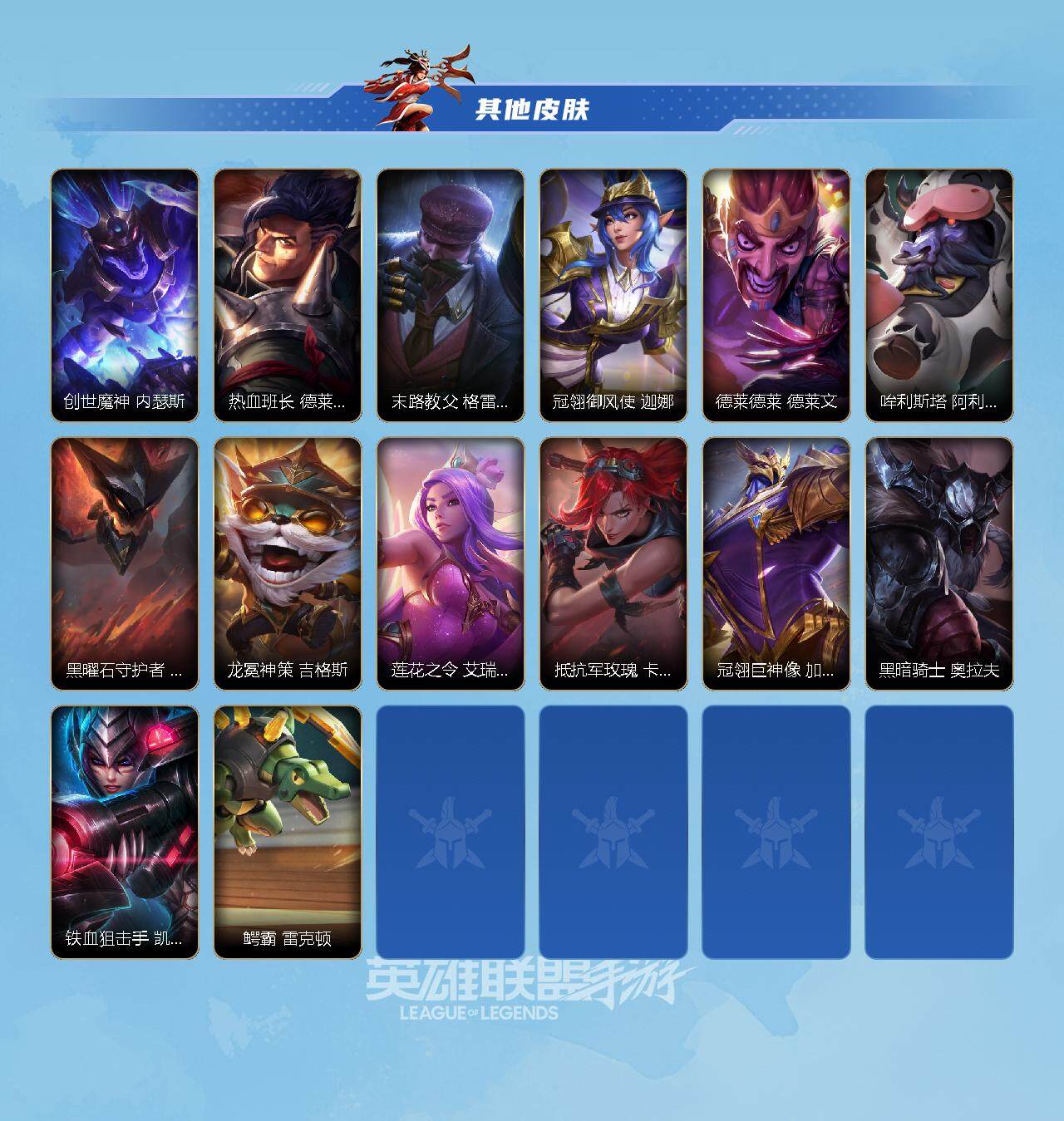 【史诗皮肤】 钢铁军团盖伦 恶魔之刃泰达米尔 腥红之月崔斯特 源计划风亚索 死亡誓约劫 虚空海灵菲兹 电玩勇者瑞文 白色死神维鲁斯 星之守护者伊泽瑞尔 灵魂烈焰布兰德 未来战士锤石