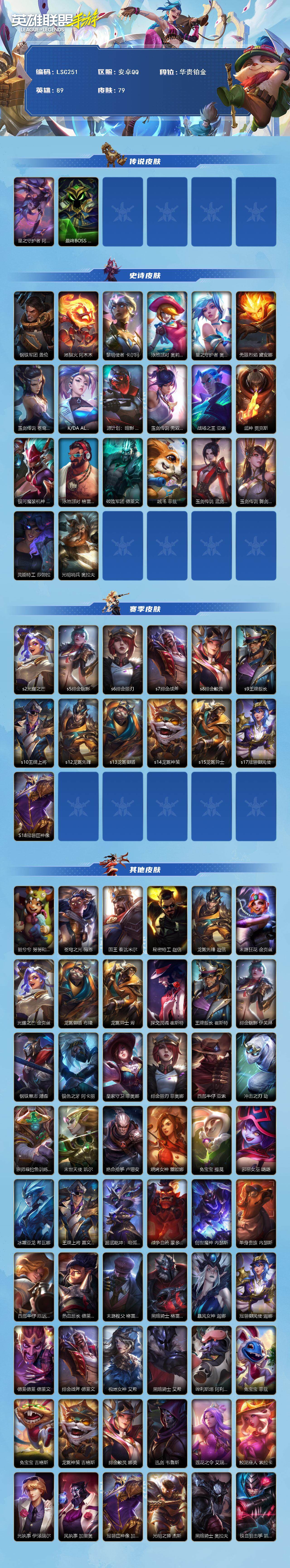 【LSC251】89英雄/79皮肤/华贵铂金/星之守护者 阿卡丽/最终BOSS维迦/钢铁军团盖伦/地狱火阿木木/黎明使者 卡尔玛/泳池派对奥利安娜/星之守护者-奥莉安娜/无限烈焰戴安娜/玉剑传说 苍鸾 莫甘娜/K/DA-阿卡丽/源计划-阿卡丽/玉剑传说 无双 菲奥娜/战场之王 亚索/武神贾克斯/银河魔装机神 希瓦娜/泳池派对 格雷福斯/破败军团 德莱文/绒毛菲兹/玉剑传说 武剑仙 锐雯/玉剑传说 舞剑仙 艾瑞莉娅/灵能特工 莎弥拉/光明哨兵 奥拉夫/s2光耀之芒/s5绯金魅影/s6绯金丽刃/s7绯金战斧/s8绯金鮫灵/s9王牌舰长/s10王牌上将/s12龙冕先锋/s13龙冕御盾/s14龙冕神策/s15龙冕异士/s17冠翎御风使/S18冠翎巨神像/脏兮兮 努努和威朗普/苍穹之光 薇恩/国王 泰达米尔/秘密特工 赵信/龙冕先锋 赵信/末路狂花 金克丝/光耀之芒 金克丝/龙冕御盾 布隆/龙冕异士 烬/探戈灵魂 崔斯特/王牌舰长 崔斯特/绯金魅影 伊芙琳/钢铁意志 潘森/银色之牙 阿卡丽/皇家守卫 菲奥娜/绯金丽刃 菲奥娜/西部牛仔 亚索/冲击之刃 劫/宗师级钓鱼训练师 贾克斯/末世天使 凯尔/绝命枪手 卢锡安/烧烤女神 蕾欧娜/兔宝宝 提莫/邪恶女巫 璐璐/冰霜亚龙 希瓦娜/王牌上将 嘉文四世/超武乾坤:电弧 凯南/战争血统 蒙多医生/创世魔神 内瑟斯/单身贵族 内瑟斯/西部牛仔 厄运小姐/热血班长 德莱厄斯/末路教父 格雷福斯/黑暗骑士 格雷福斯/暴风女神 迦娜/冠翎御风使 迦娜/德莱德莱 德莱文/绯金战斧 德莱文/极地女神 艾希/黑暗骑士 艾希/哞利斯塔 阿利斯塔/兔宝宝 菲兹/兔宝宝 吉格斯/龙冕神策 吉格斯/绯金鲛灵 娜美/迅箭 韦鲁斯/莲花之令 艾瑞莉娅/蕉泥座人 索拉卡/光执事 伊泽瑞尔/风执事 加里奥/冠翎巨神像 加里奥/光明之锤 杰斯/黑暗骑士 奥拉夫/铁血狙击手 凯特琳/黑暗骑士 布兰德/鳄霸 雷克顿/猛龙 雷克顿【二次实名: 可二次】
